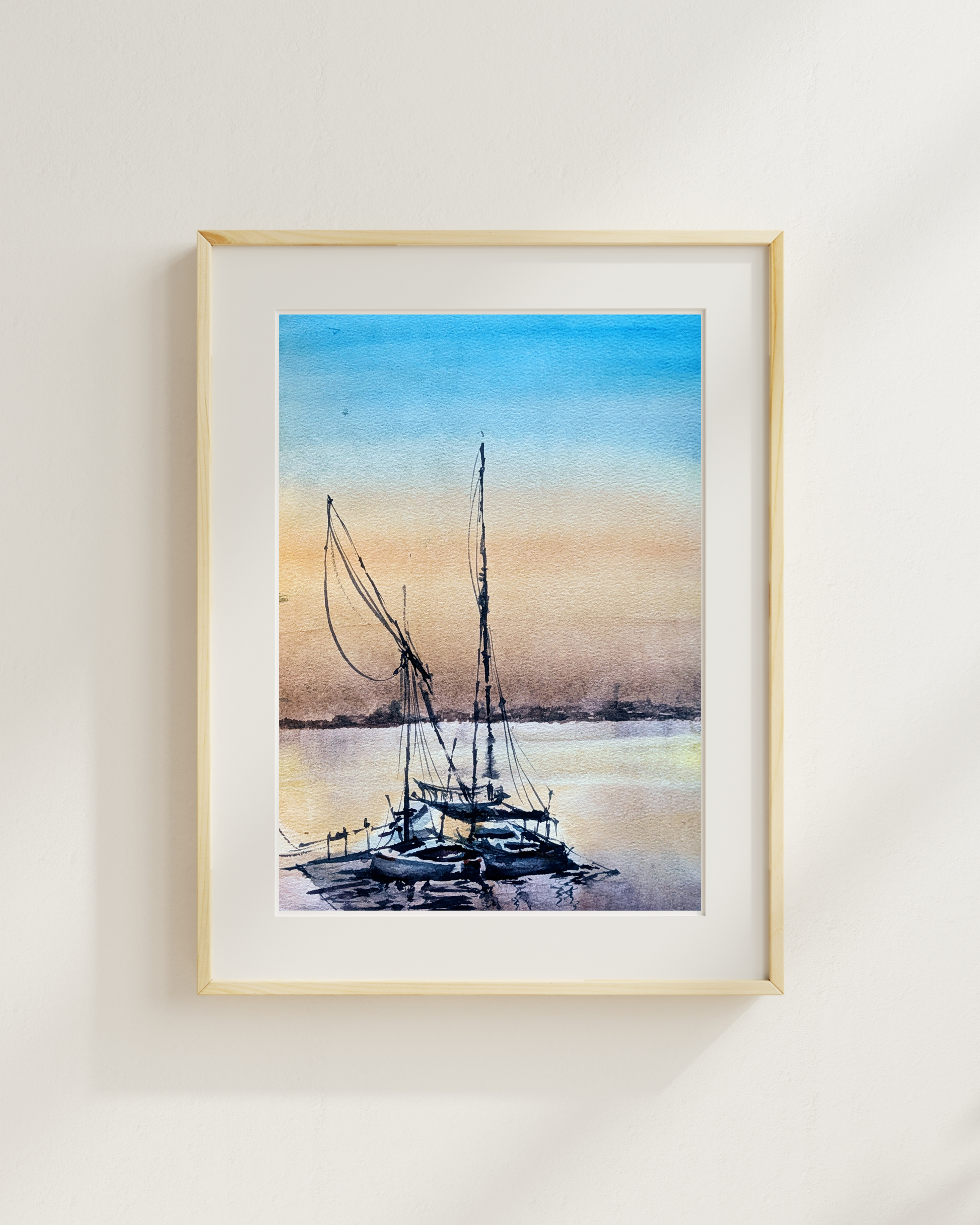 Sails at rest, water aglow — this tranquil scene captures the quiet poetry of boats silhouetted against a fading sun. With soft gradients and delicate reflections, this piece evokes stillness, warmth, and the calm that comes just before nightfall.
