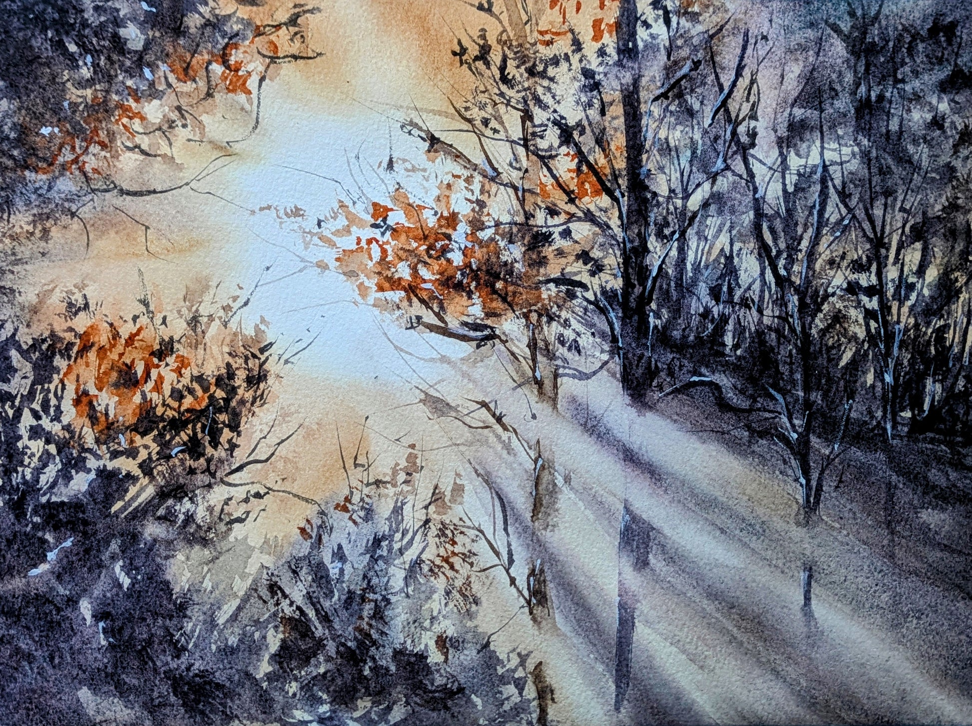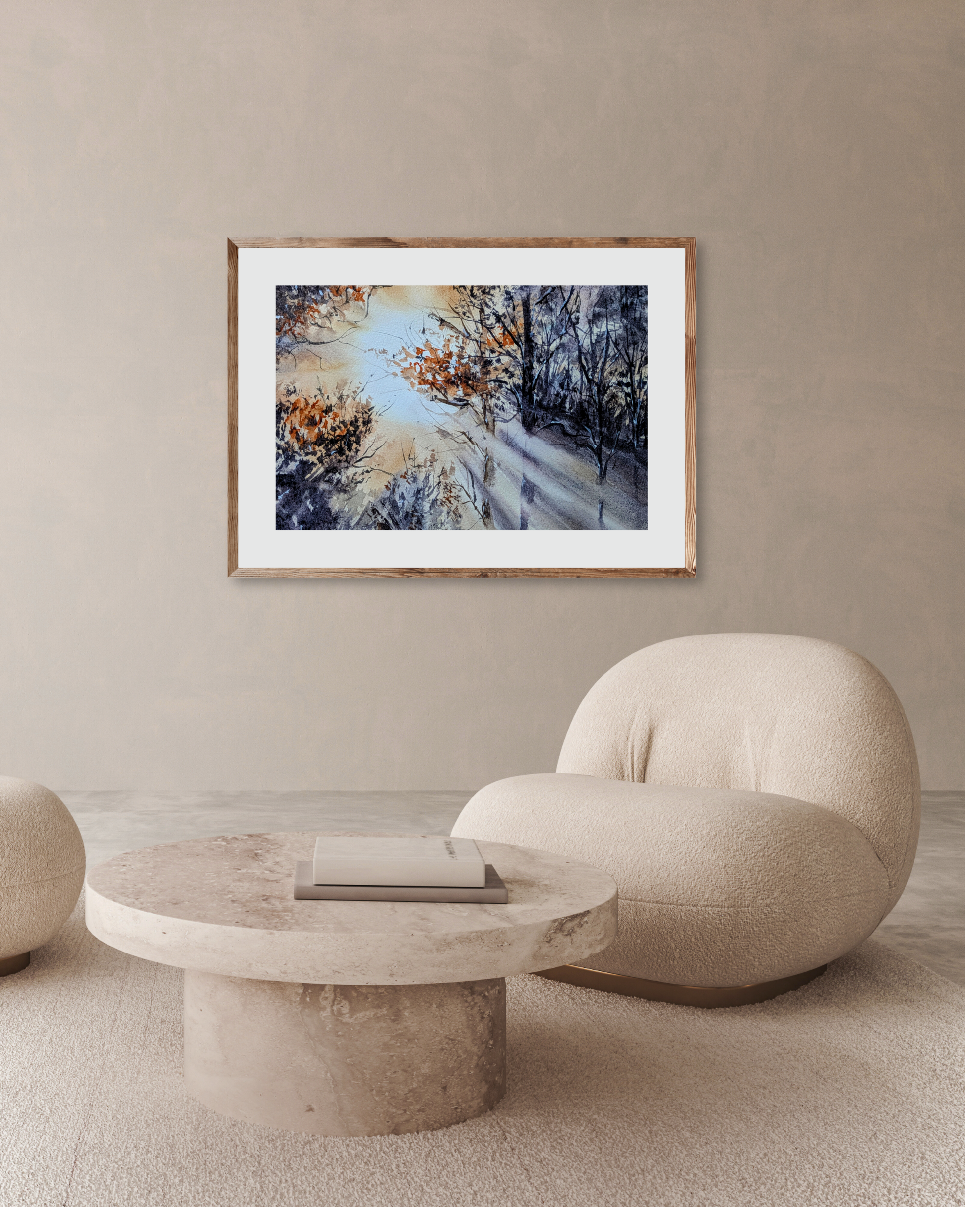 Golden beams pierce through a dense forest, casting long shadows and warming autumn foliage. “The Light” captures that fleeting moment when nature is bathed in quiet brilliance — a gentle reminder of beauty found in stillness and transition.